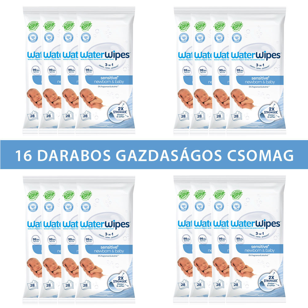 WaterWipes Biodegradable Nedves Törlőkendő Utazó Csomag Mega Pack 16x28db (448db) - Műanyagmentes, 99,9% Tisztított Víz és Grapefruit Kivonat, Érzékeny Bőrre